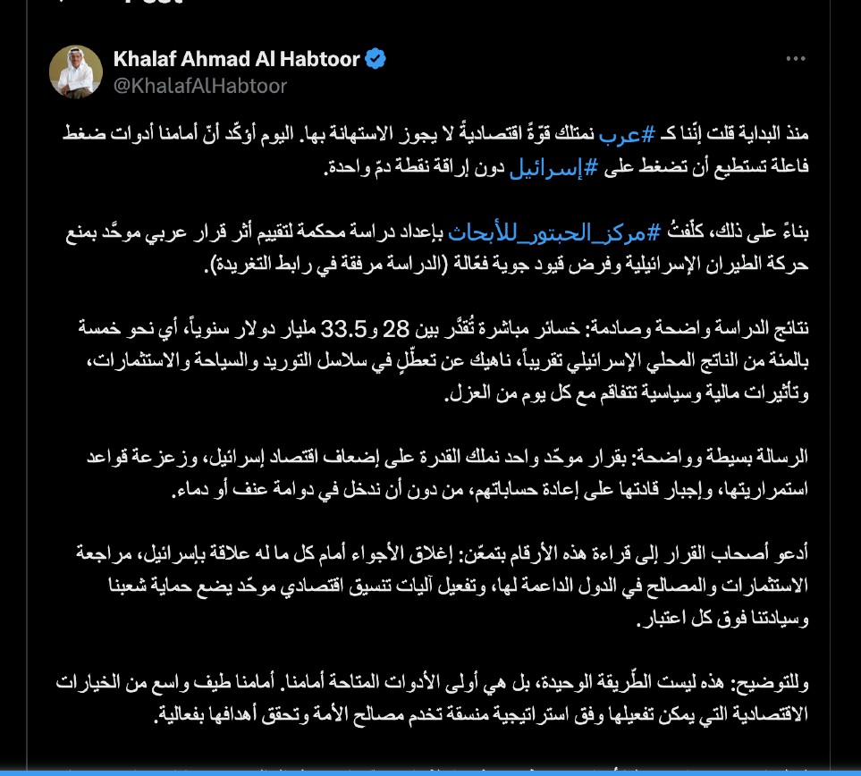 قرَّرت بعض الدولِ العربيةِ الأخذَ بالرأيِ الاستشاريِّ «المنسوبِ» إلى مركزِ الحبتورِ للدِراساتِ، والذي بيَّنَ أنَّ قرارًا عربيًّا موحَّدًا بمنعِ حركةِ الطيرانِ الإسرائيليةِ فوقَ الأراضي العربيةِ وفرضَ قيودٍ جوّيةٍ عليها كفيلٌ بتكبيدِ إسرائيلَ خسائرَ مباشرةً تُقدَّرُ بـ28 إلى 33.5 مليارَ دولارٍ سنويًّا، أي نحوَ 5% من الناتجِ المحليِّ الإسرائيليِّ؟