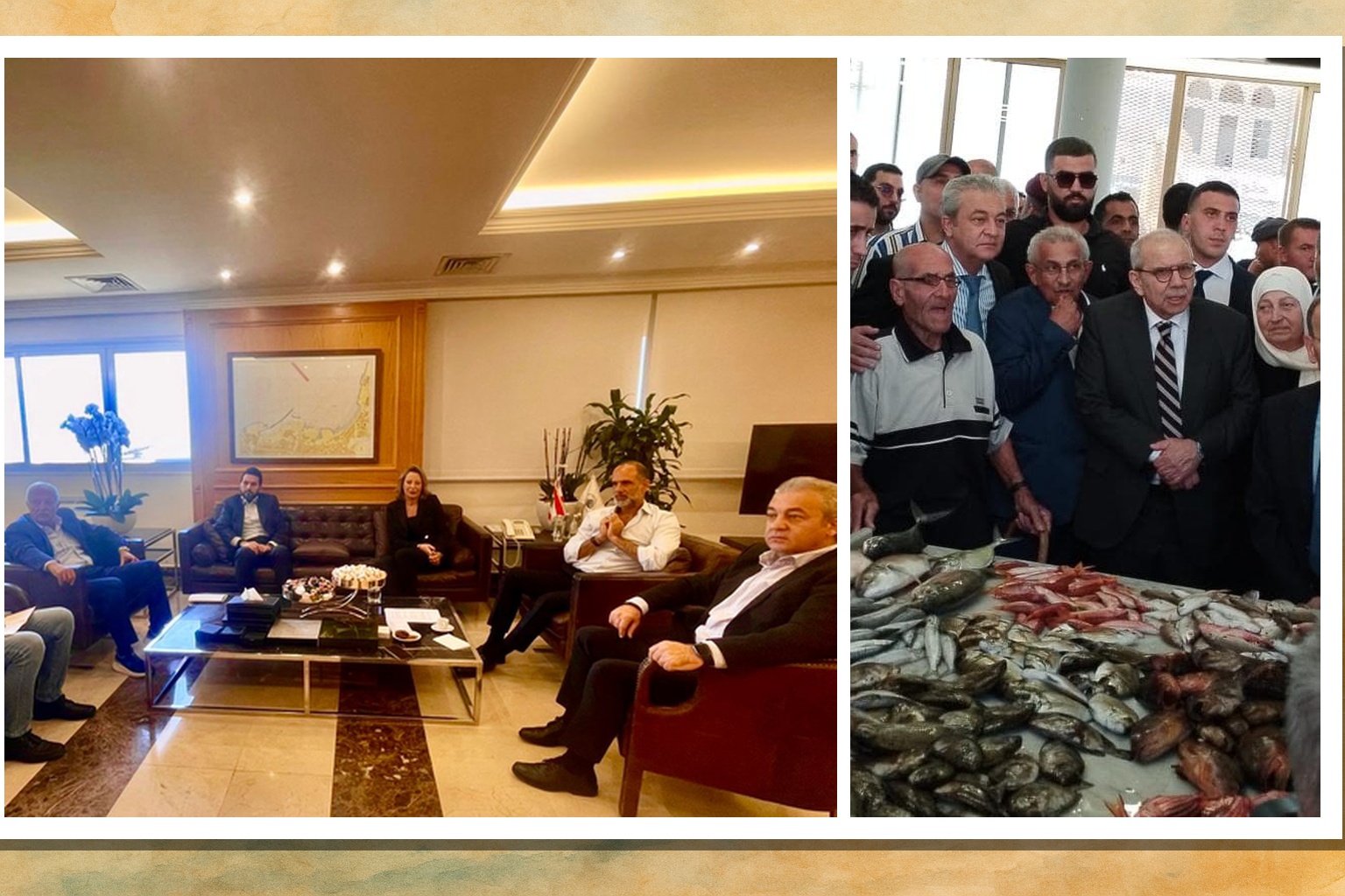أما الصورة الثانية فلرئيس الحكومة نواف سلام مع “زعماء” المدينة على “بسطة” سمك في “الميرة” (سوق السمك).